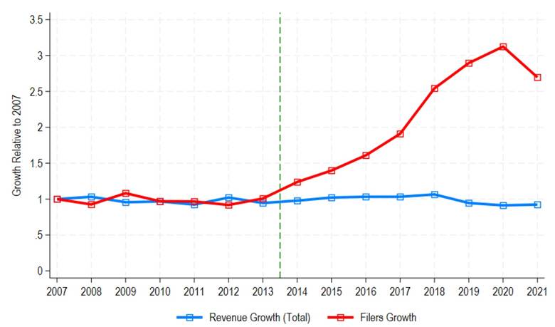 Figure 4: More filers, not more revenue. Filing expanded; revenue did not. Pakistan has become adept at producing “junk filers”. Source: Waseem (2024 presentation), using FBR Yearbook 2022–23