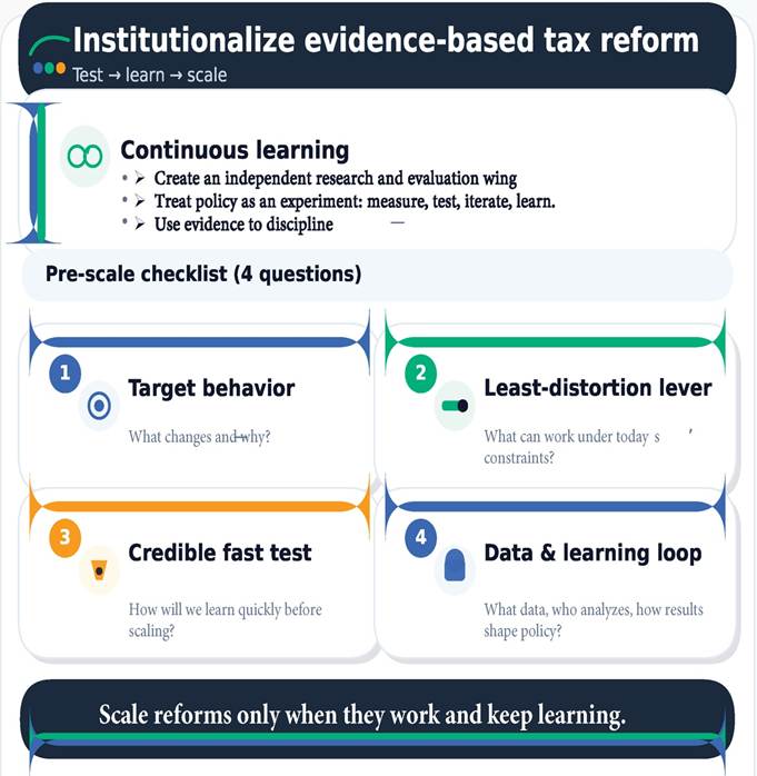 Figure 6: Institutionalizing evidence-based tax reform: continuous learning and a pre-scale checklist to test, learn, and scale responsibly.