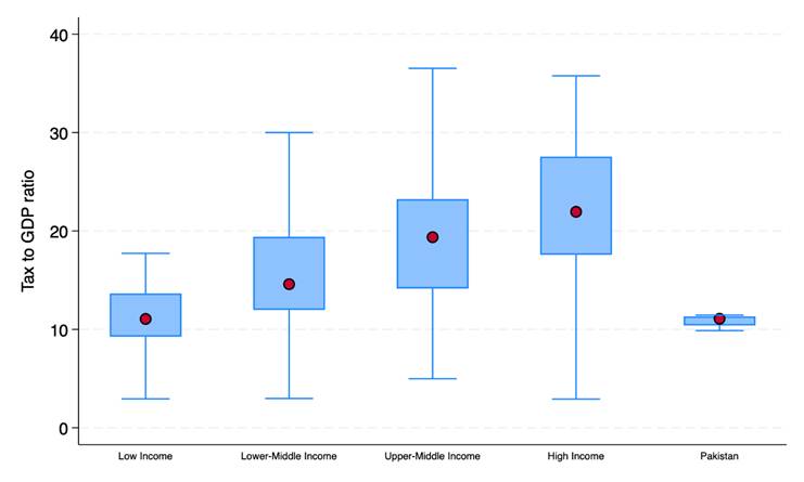 Figure 1: Pakistan collects far less tax revenue (as a share of GDP) than peer income groups. Data Source: UNU-WIDER Government Revenue Dataset (GRD 2023), averages for post-2015 years. Boxes show the middle 50% of countries in each income group (25th–75th percentiles); whiskers show the broader spread, and the dot is the group average.